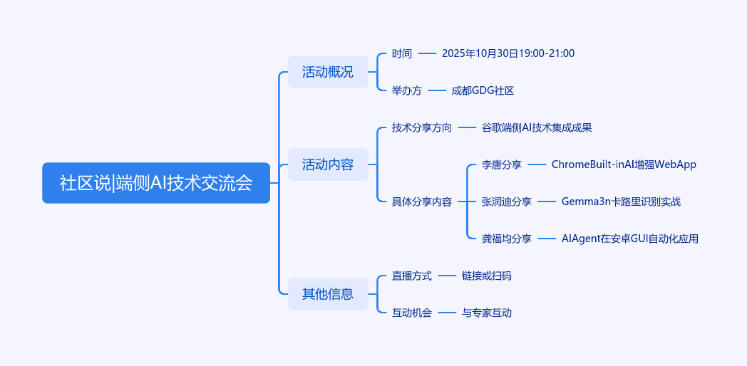 2025年10月30日19:00 - 21:00将举办社区说端侧AI技术会,由成都GDG社区举办。三位一线技术专家分享谷歌端侧AI技术在移动和Web开发集成成果,涵盖利用Chrome内置AI与模型为Web注入智能、用Gemma 3n在安卓实现卡路里识别、AI Agent在安卓GUI自动化架构设计等内容,为不同开发者提供端侧AI集成方法,助力构建智能应用体系,直播可通过链接或扫码预约,还有与专家互动机会。