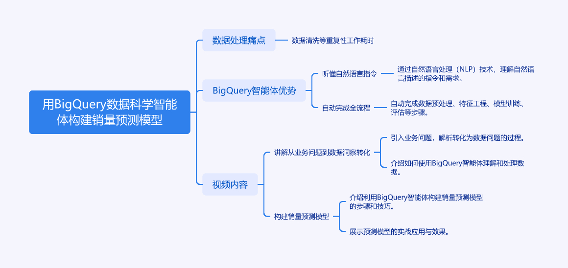 文章介绍了 Google Cloud 的 BigQuery 数据科学智能体。指出数据清洗、特征工程、模型调试等重复性工作耗费时间,而该智能体可听懂自然语言指令,自动完成从规划、执行到错误修复的全流程,帮用户从代码中解放,实现业务问题到数据洞察的高速转化,还提到本期视频会深入讲解其如何构建销量预测模型。