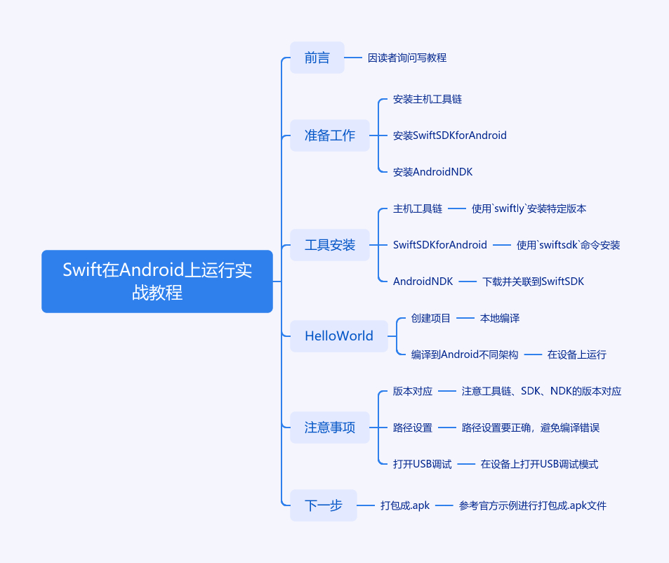 文章是 Swift 在 Android 上运行的实战教程。先介绍准备工作,需安装主机工具链、Swift SDK for Android 和 Android NDK 且版本要匹配。接着说明各工具安装方法,主机工具链用 swiftly 安装特定版本,Swift SDK for Android 用 swift sdk 命令安装,Android NDK 下载后关联到 Swift SDK。然后通过 Hello World 示例,展示本地编译、编译到 Android 不同架构及在设备上运行的步骤。最后提醒注意版本对应、路径设置和打开 USB 调试,还指出后续可参考官方仓库打包成 .apk。此方法适合有 iOS 项目团队复用业务逻辑。