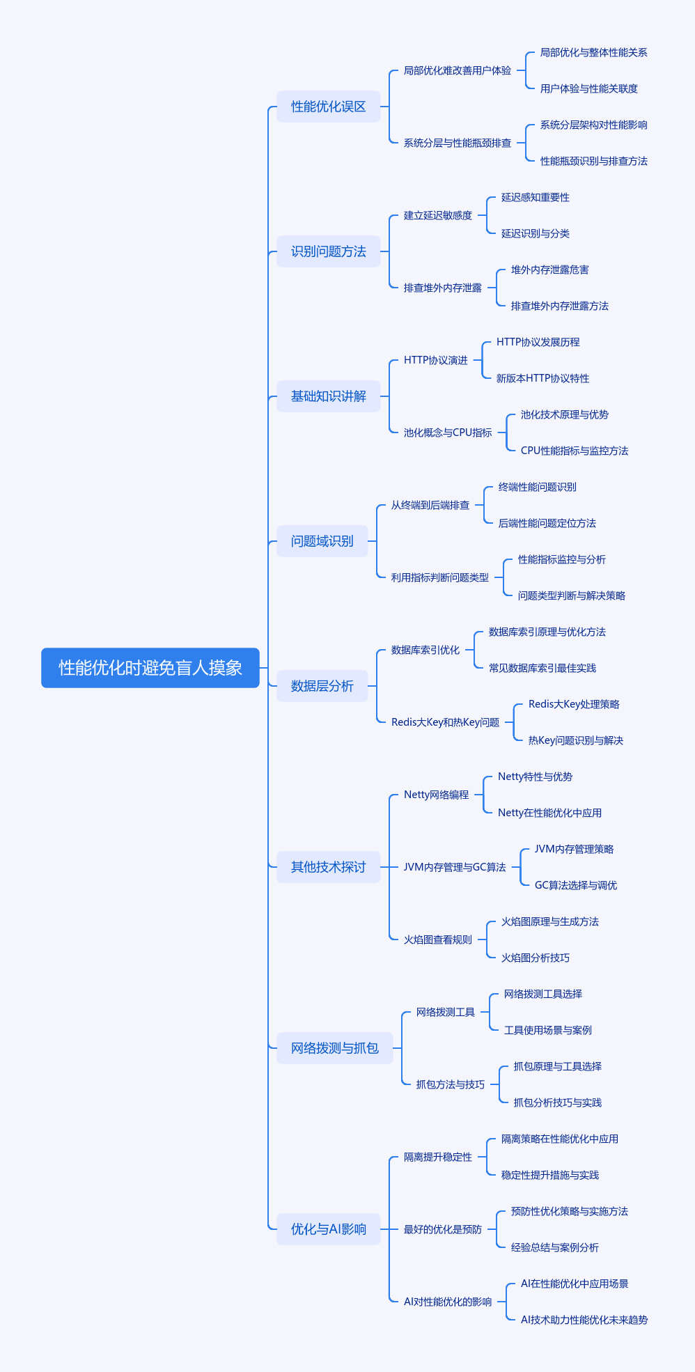 文章围绕性能优化展开,探讨如何避免盲人摸象。先指出性能优化易陷入局部,应基于全链路视角,如分析系统分层和性能瓶颈。介绍识别问题的方法,包括建立延迟敏感度、排查堆外内存泄露等。阐述基础知识,如HTTP协议演进、池化概念、CPU指标等。还提及快速识别问题域的步骤,从终端到后端各节点排查。分析数据层问题,如数据库索引优化、Redis大字段影响等。介绍Netty、JVM、火焰图、网络拨测等相关内容及优化方法。强调隔离对稳定性的重要性,探讨性能优化时机,认为最好的优化是预防,并探讨AI对性能优化的影响。
