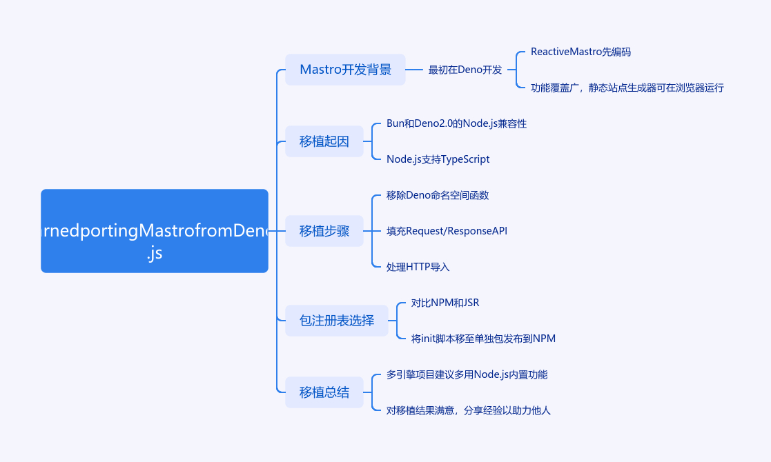作者分享将 Mastro 从 Deno 移植到 Node.js 的经历。Mastro 最初仅在浏览器和 Deno 运行,因 Deno 标准库丰富、支持 Web 标准和 TypeScript。随着 Bun 和 Deno 2.0 支持 Node.js 兼容,作者考虑移植。移植时,移除 Deno 命名空间函数,用 Node.js 等效函数替换;因 Node.js 不支持 Request/Response API 和 HTTP 导入,分别用 @remix - run/node - fetch - server 包和重组代码解决。作者还对比 NPM 和 JSR 包注册表,最终将 init 脚本移至单独包发布到 NPM。作者认为若重新开始多引擎项目,会多用 Node.js 内置功能,但对此次移植结果满意,也希望读者避免一些陷阱。