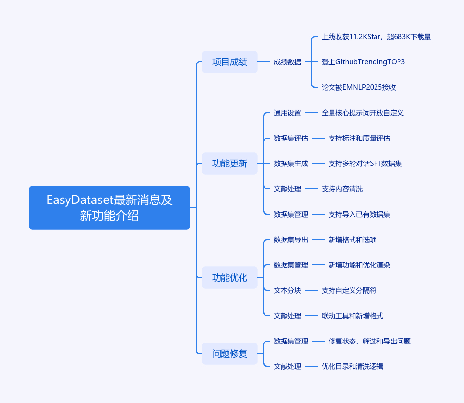 本文介绍了Easy Dataset的最新消息和新功能。该应用专为创建大模型数据集设计,上线后获11.2K Star、超683K下载量,登上Github Trending TOP3,论文被EMNLP 2025接收。功能更新包括全量核心提示词开放自定义;支持数据集标注、评估;能生成多轮对话SFT数据集;可对文献内容清洗;支持导入已有数据集。还有一些功能优化,如新增导出格式、“取消确认”功能等,也修复了数据集管理和文献处理中的问题。