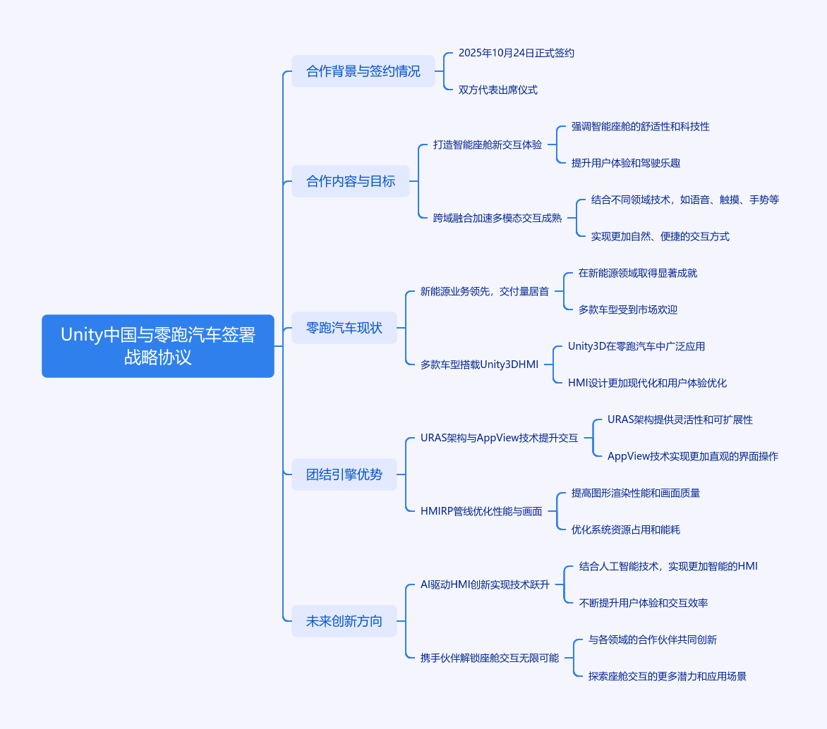 2025年10月24日,Unity中国与零跑汽车签署战略合作协议,携手打造下一代智能座舱全新交互体验。双方将实现Unity引擎、AI大模型、生物传感器跨域融合,加速多模态交互成熟。目前,零跑多款畅销车型已搭载由Unity驱动的3D HMI。团结引擎车机版在汽车3D HMI打造上有技术优势,其URAS架构和App View技术能提升座舱交互自由度与集成度。未来,双方会探索AI驱动的HMI创新方向,实现多模态融合“无感化交互”等技术跃升,让汽车座舱更智能。
