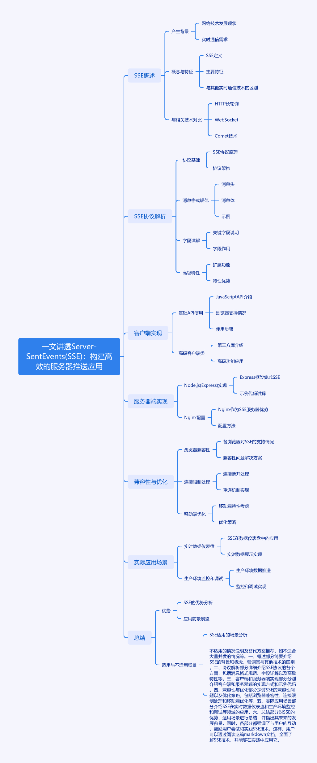 本文详细介绍Server - Sent Events (SSE) 技术。SSE基于HTTP,实现服务器向客户端单向实时通信,具有单向通信、自动重连等特征,与WebSocket、长轮询等技术适用场景不同。文中深度解析SSE协议,包括基础、消息格式和高级特性。客户端通过EventSource建立连接,还给出高级客户端类示例。服务器端以Node.js (Express) 为例给出实现,同时介绍Nginx配置。此外,提及浏览器兼容性、连接限制处理、移动端优化方法。最后阐述SSE在实时数据仪表盘、生产环境监控等场景的应用,总结其优势、适用与不适用场景及生产环境要点。
