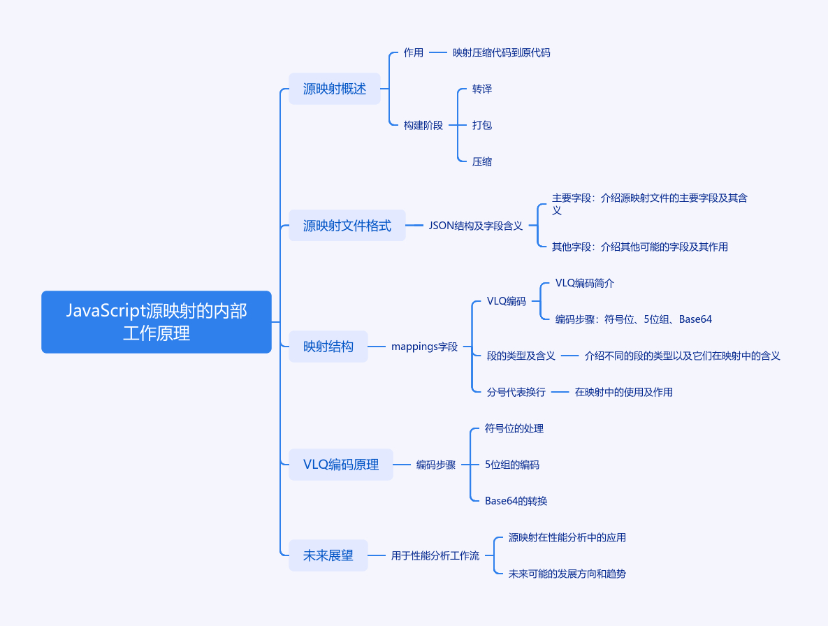 文章深入介绍 JavaScript 源映射工作原理。源映射能将压缩后的 JavaScript 文件符号和位置映射回原始代码,如调试时可显示原代码。现代 JavaScript 构建分转译、打包、压缩三阶段,各阶段源映射都保留与原代码的联系。源映射文件为 JSON 格式,核心是 mappings 字段,采用 VLQ 编码压缩映射数据。映射字符串由逗号和分号分隔成段,段有 1、4、5 值三种情况,4 值最常见,分号代表换行。VLQ 编码分三步:编码符号位、拆成 5 位组、转 Base64。最后作者表示源映射支持将用于性能分析工作流。