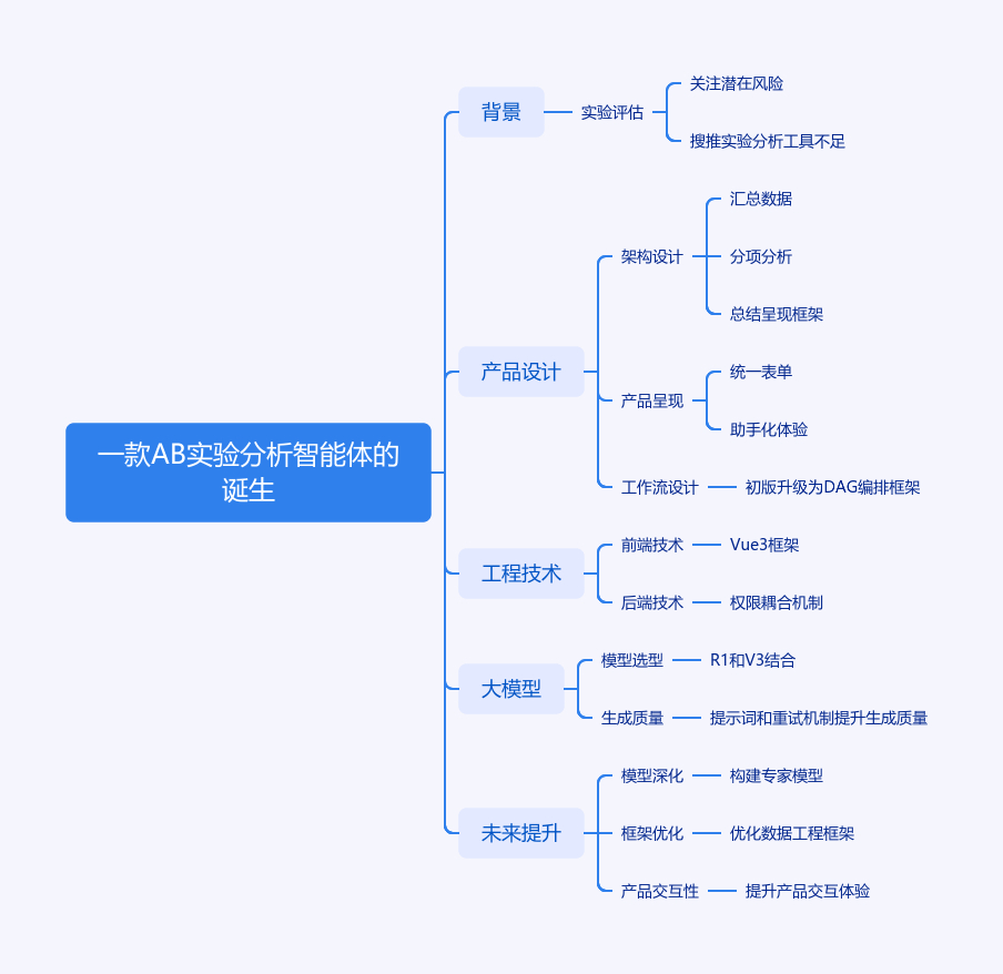 本文围绕一款AB实验分析智能体的诞生展开。背景上,以往算法实验仅关注正向指标提升不足,需评估潜在风险,且搜推实验分析工具不全。产品设计方面,形成‘汇总数据—分项分析—总结呈现’框架,采用模块化分层解耦架构;设计统一表单,解决多工具表单差异问题;工作流从初版planner升级为基于DAG的编排框架。工程技术上,前端用Vue 3框架等,有鉴权等能力;后端设计权限耦合机制。大模型选型结合R1和V3,通过提示词工程和重试机制提升生成质量。未来计划构建专家模型、优化数据工程框架、提升产品交互性。