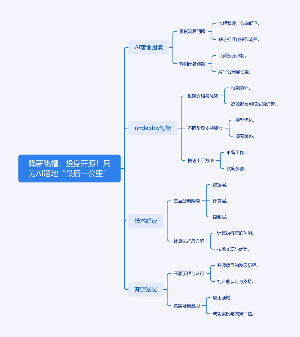 本文介绍了专为AI落地最后一公里而生的端侧AI部署框架nndeploy。大厂工程师Always为解决AI落地重复流程问题,降薪跳槽做开源。nndeploy通过可视化工作流降低门槛,统一接口搞定多端推理,将AI落地时间从数周缩至几天。它为不同阶段工程师量身打造能力,如新手友好、专业进阶、高效实战。上手简单,5分钟可部署应用。采用三层分离架构,计算执行层是核心。该项目于2023年8月开源,获认可,在真实场景应用,助力AI落地。