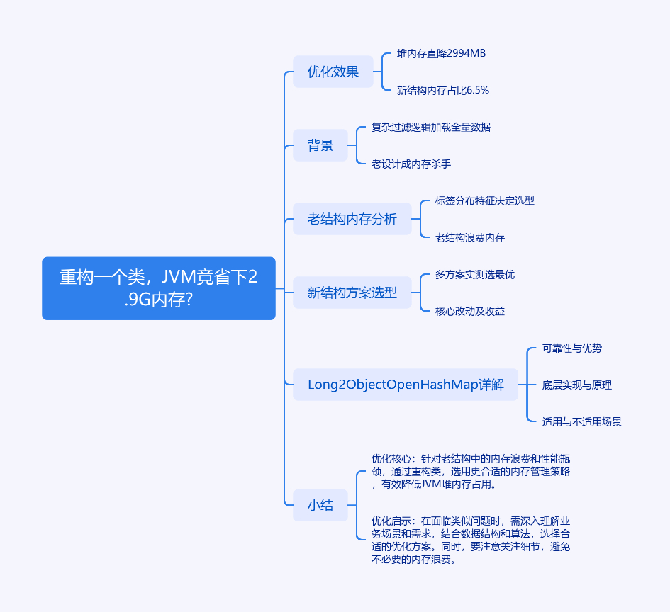 文章介绍了重构一个类使 JVM 节省 2.9G 内存的案例。核心业务链路中,因复杂过滤逻辑将全量商品标签数据加载至内存,原“通用集合嵌套”设计成内存消耗大户。老结构中,HashMap<Long, HashSet<String>> 存在诸多问题,如 String 类型标签浪费内存。经分析标签分布,选择将 HashMap<Long, ?> 换为 Long2ObjectOpenHashMap<?>,HashSet<String> 换为排序后的 int[] 加二分查找。优化后内存占用直降 94%+,从 3.13G 降至 200M 量级。还详细介绍了 Long2ObjectOpenHashMap 的底层机制、优缺点及适用场景。