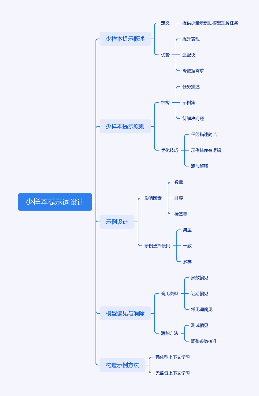文章围绕少样本提示词设计展开。少样本提示是提供少量示例助模型理解任务,有提升表现、快速适配、降低数据需求等优势。其原则包括结构含任务描述、示例集、待解决问题,任务描述要简洁,示例排序有逻辑,可添加解释增强可解释性。示例设计要考虑数量、排序、标签分布等因素。模型做任务存在多数标签、近期、常见词三种偏见,可通过测偏见、调参数校准。如今模型上下文窗口变大,可构造更多示例,有强化型上下文学习和无监督上下文学习两种新方法。