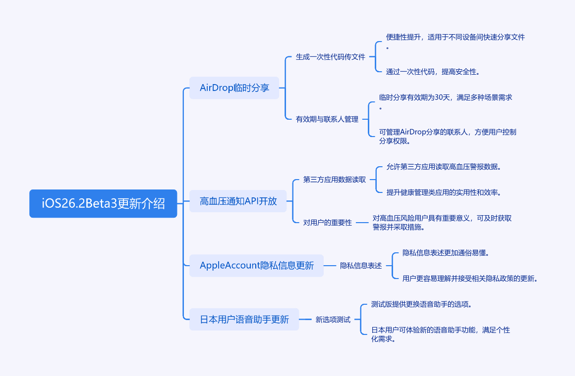 2025年11月17日苹果向开发者推送iOS 26.2 Beta 3测试版。此次更新亮点颇多,AirDrop支持临时分享,可生成一次性代码,适合展会、培训等场景,有效期30天,还能管理已分享联系人;开放高血压通知API,第三方健康应用可读取Apple Watch上的高血压警报数据;Apple Account更新隐私信息表述,更通俗易懂;日本用户可更换默认语音助手。目前是Beta 3版,开发者或尝鲜者可试用,普通用户等正式版。