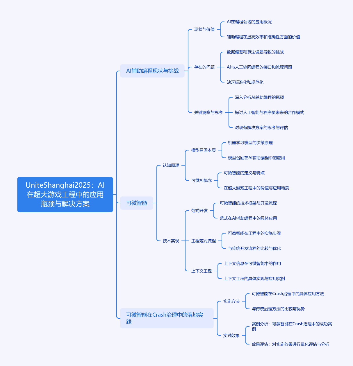 Unite Shanghai 2025上,腾讯天美J1余煜与igins牟骞分享《AI在超大游戏工程中的应用瓶颈与解决方案》。AI辅助编程虽有价值,但存在记忆断裂、编造信息等问题,有“70%陷阱”。为让AI更好工作,提出可微智能概念,其认知原理为控制信息熵增,包含可微分、可预测、可逆性。技术实现启用范式开发,包括拆解专家见解、任务数据结构与状态机、上下文工程,可降低模型能力要求。以树结构为例说明工程范式流程,强调上下文工程重要性。在Crash治理中,可微智能通过全局视野分析等落地,实践验证其在运行效率、成本、准确性上有提升,解决国外模型封锁问题。