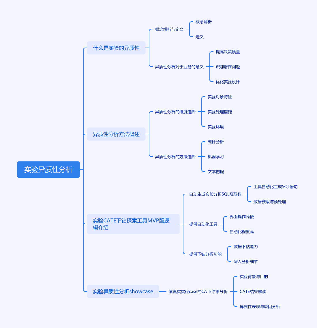 文章围绕实验异质性分析展开。首先介绍异质性,HTE指同一处理对不同样本效果不同,还讲解了ATE、CATE、ITE概念,其分析对业务意义重大,如挖掘业务逻辑、找最优子人群等。接着阐述异质性分析方法,维度选择要满足与实验分流无关,还给出bad case举例;方法选择有相关图示。然后介绍实验CATE下钻探索工具MVP版逻辑,可半自动化实现异质性探索分析。最后通过真实实验case说明,整体指标负向不显著时,子人群有正负向显著效果,利于产品针对性优化。