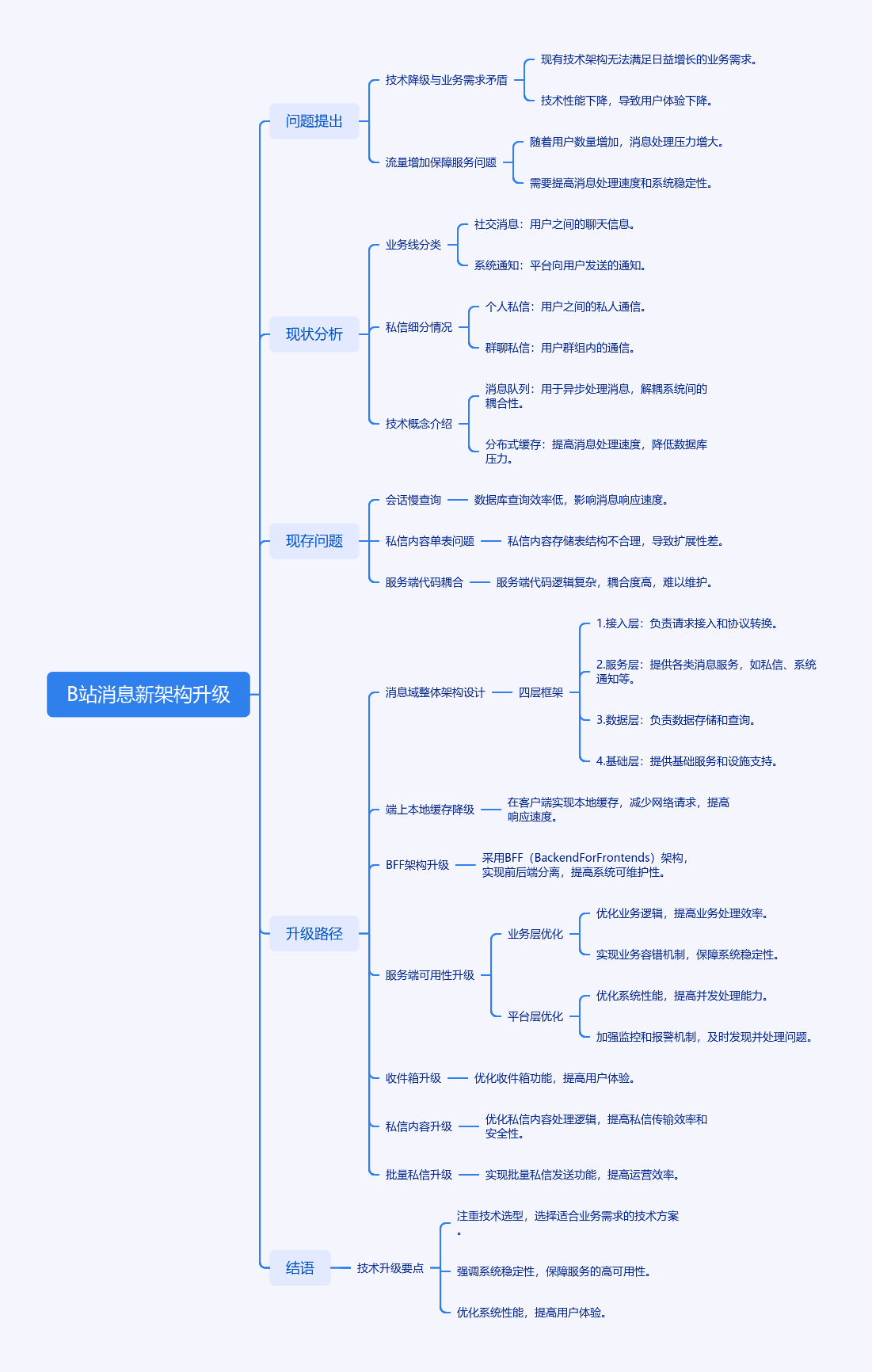 文章围绕B站消息新架构升级展开。先提出技术与业务需求的矛盾问题,接着分析现状,业务分客服、系统通知等4条线,私信细分未解耦,触达率有提升空间;技术上介绍私信域概念。指出存在的问题,如会话慢查询、私信内容单表空间和写性能接近天花板、服务端代码耦合。升级路径上,设计兼顾复杂列表查询和IM架构的四层消息域框架,包括接入、业务、平台、触达层。采用端上缓存降级、BFF架构升级、服务端可用性升级等措施,如冷热分离、读写分离、缓存主动预热、泰山和Mysql双持久化等,还对收件箱、私信内容、批量私信等进行优化。最后强调技术升级要逐步进行,关注新老架构过渡和优化。