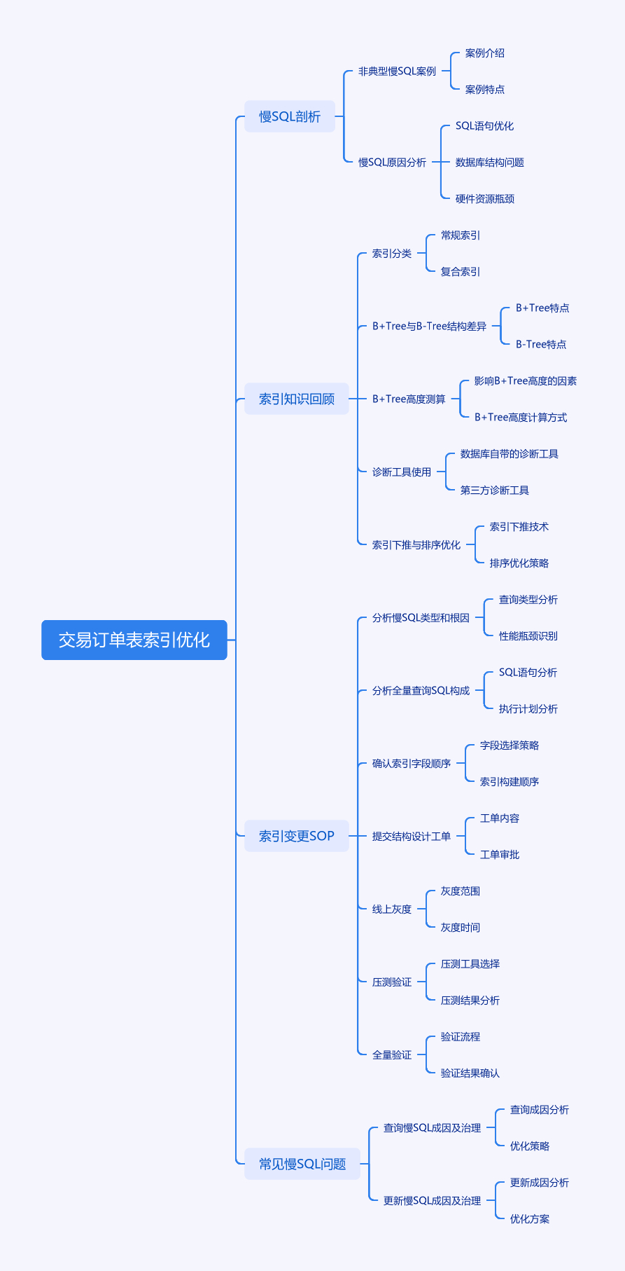 文章围绕交易订单表索引优化展开。先以淘天电商非典型慢 SQL 剖析为例,介绍慢 SQL 分析排查方法。接着阐述索引优化理论,涵盖索引分类、B+Tree 与 B‑Tree 结构差异、B+Tree 高度估算、诊断工具使用、索引下推与排序执行流程等。然后提出适用于大规模线上集群的索引变更 SOP,包括分析慢 SQL、查询 SQL,确认索引字段顺序,提交工单,线上灰度、压测、全量验证等步骤。最后总结常见慢 SQL 成因,如区分度大的字段无索引、索引选择错误等,并给出相应解决策略。