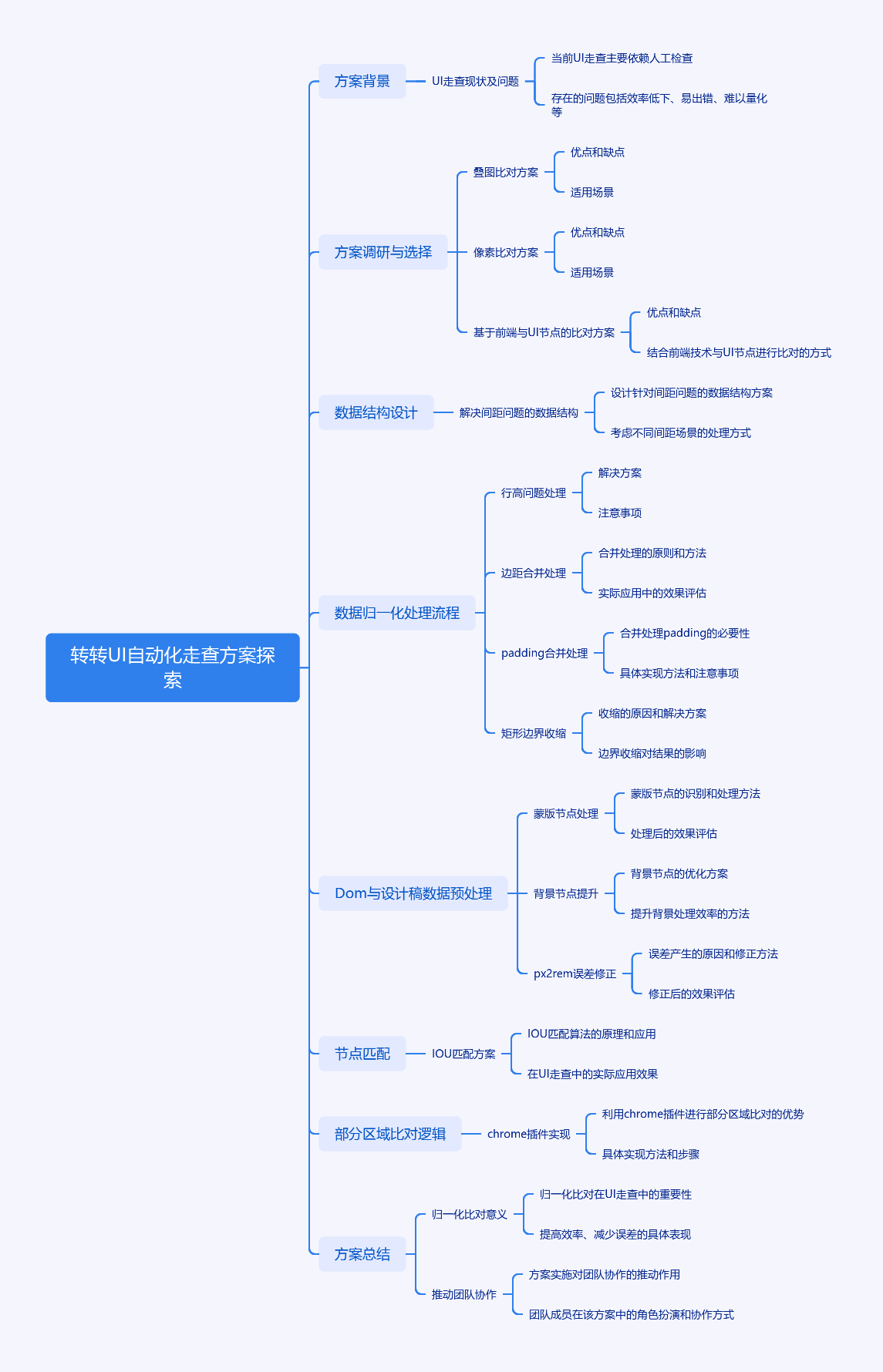 文章围绕转转UI自动化走查方案展开。当前UI走查难接入自动化流程,交付质量难管控、效率低。调研了叠图比对、像素比对等方案,认为都非最佳。提出基于前端与UI节点的比对方案,设计了归一化数据结构。介绍数据归一化处理流程,包括处理行高、边距合并、padding合并、收缩矩形边界等。还阐述Dom与设计稿数据预处理逻辑,如蒙版节点处理、背景节点提升、px2rem误差修正。节点匹配采用IOU方案,有优化空间。开发了部分区域比对逻辑,通过chrome插件让用户选区域。最后指出方案核心是将设计稿和DOM树归一化比对,虽匹配准确率待提升,但建立了可量化标准,推动前端工程化和团队协作。