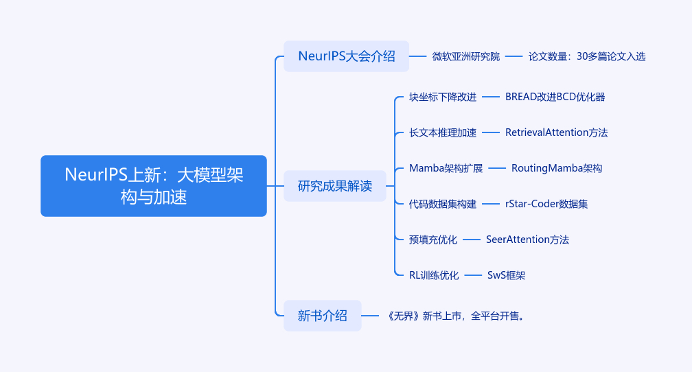 全球顶级人工智能盛会NeurIPS 2025即将开幕,微软亚洲研究院30多篇论文入选。文章介绍了第一期“NeurIPS上新”相关研究,包括大模型架构与加速等方面。如BREAD方法改进BCD优化器,减少微调内存消耗;RetrievalAttention解决长文本推理难题;Routing Mamba将MoE机制集成到Mamba投影层;rStar - Coder构建大规模代码推理数据集;SeerAttention实现长上下文预填充优化;SwS框架提高RL训练样本效率。此外,微软亚洲研究院新书《无界》上市。