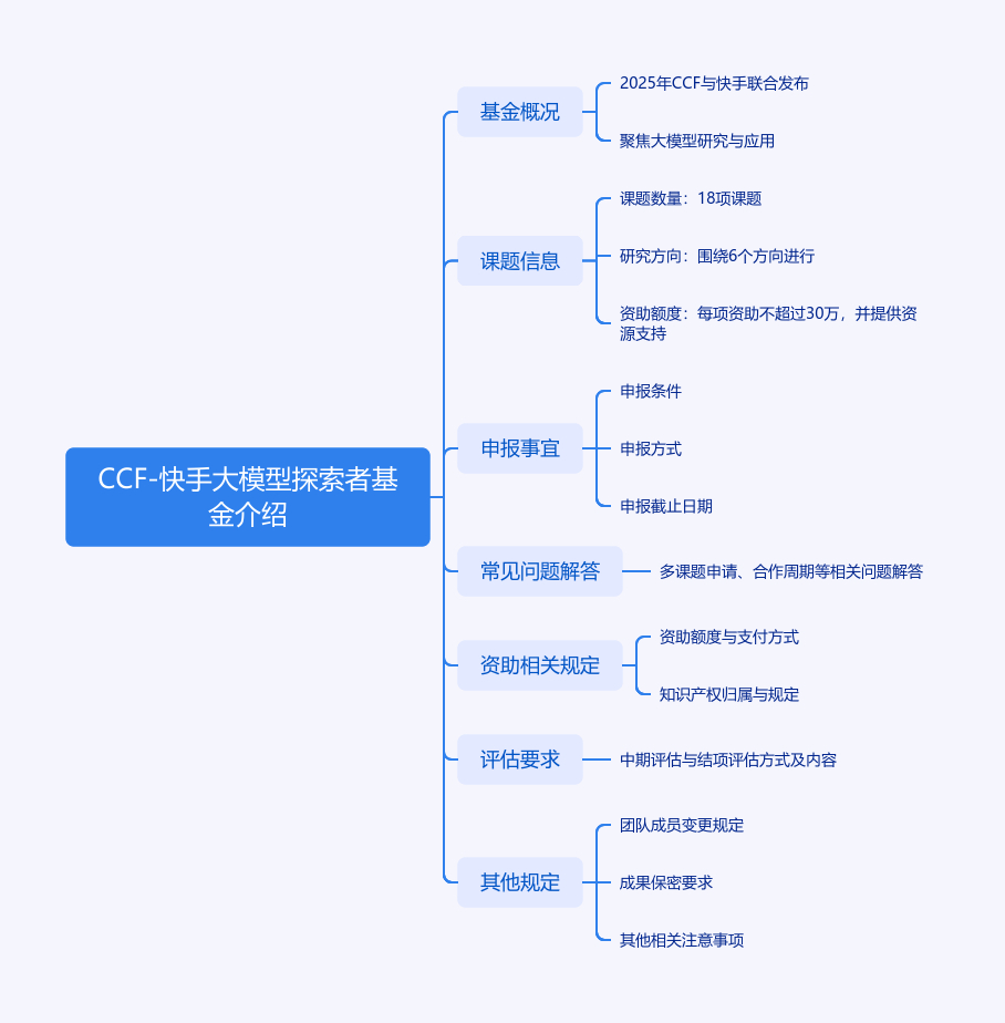 2025年CCF与快手联合发布第二期“CCF - 快手大模型探索者基金”,聚焦大模型技术研究与应用。本年度发布18项课题,围绕6个方向,每项资助不超30万,快手提供技术等支持及学生实习机会。文章给出申报条件、方式、截止日期等信息,还对多课题申请、合作周期、研究方向选择等常见问题做解答,明确资助支付、评估要求、知识产权归属等内容。