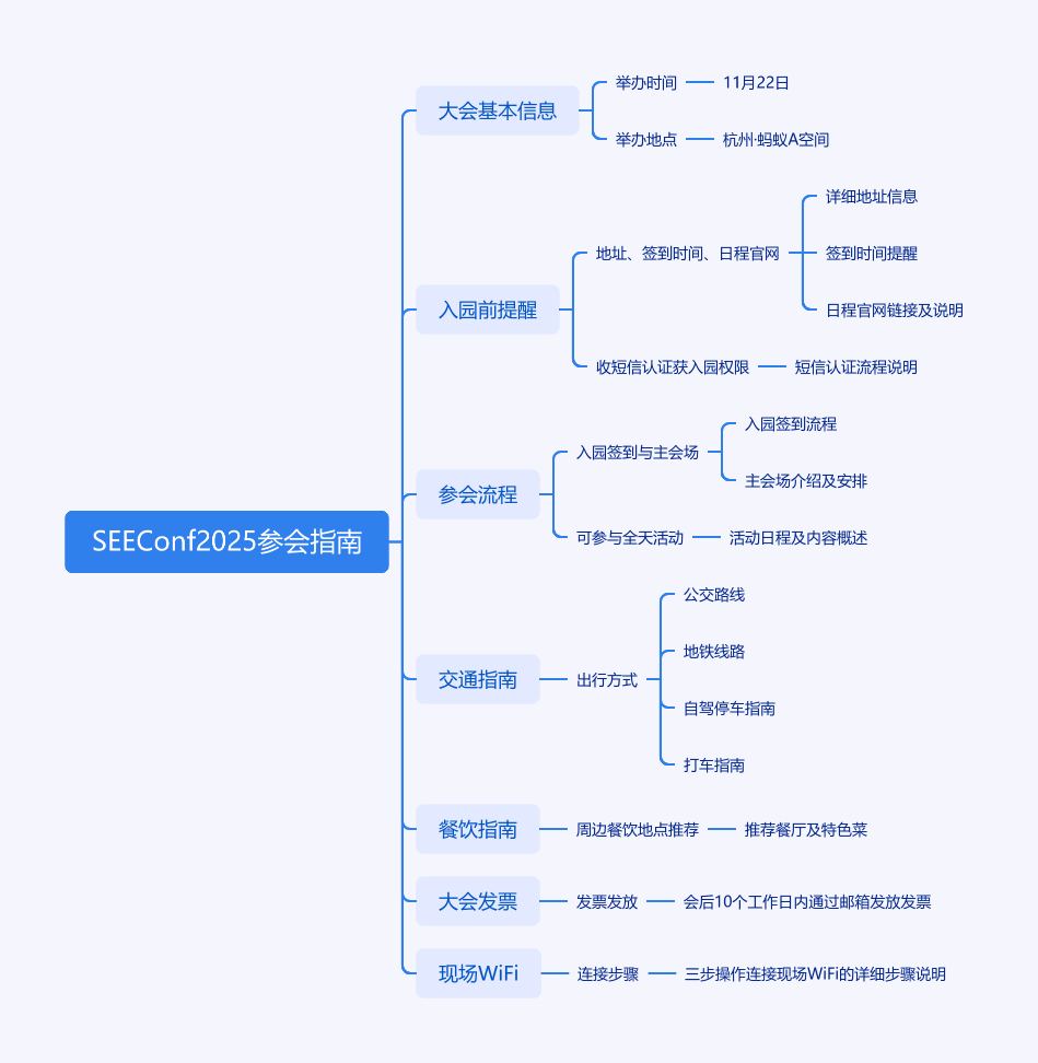 SEE Conf 2025 将于 11 月 22 日在杭州·蚂蚁 A 空间举办,组委会发布《参会指南》。入园前需注意大会地址、签到时间,日程可查官网。购买门票后 11 月 21 日前收访客短信,支付宝搜“蚂蚁访客”完成实名认证获入园权限。入园后大堂签到处出示电子票签到。交通方面,可选择公交、地铁、自驾、打车等方式。餐饮可去蚂蚁 A 空间访客大堂东门周边、美帆广场、天目里商圈等地。发票会在会议结束后 10 个工作日内发至申请邮箱,现场连 WiFi 按三步操作,有疑问可加答疑群。