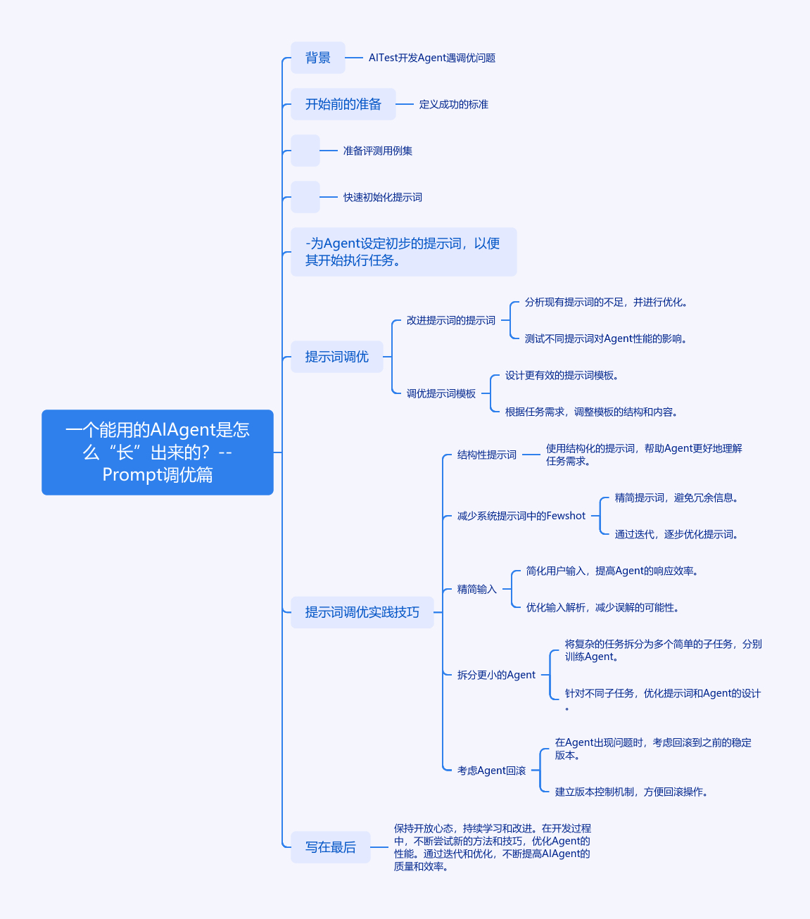 本文围绕AI Agent开发中Prompt调优展开,分享经验。开发AITest的Agent时,开发初版快,但效果调优遇问题。开始前要定义成功标准,准备评测用例集,快速初始化提示词。提示词调优方面,推荐用AI改进,给出调优提示词模板。实践技巧包括用结构性提示词,如确定目标、拆分任务等;减少系统提示词中的Few shot;精简输入;拆分更小的Agent;考虑Agent回滚。强调好的Agent是在不断测试、迭代、优化中“长”出来的。