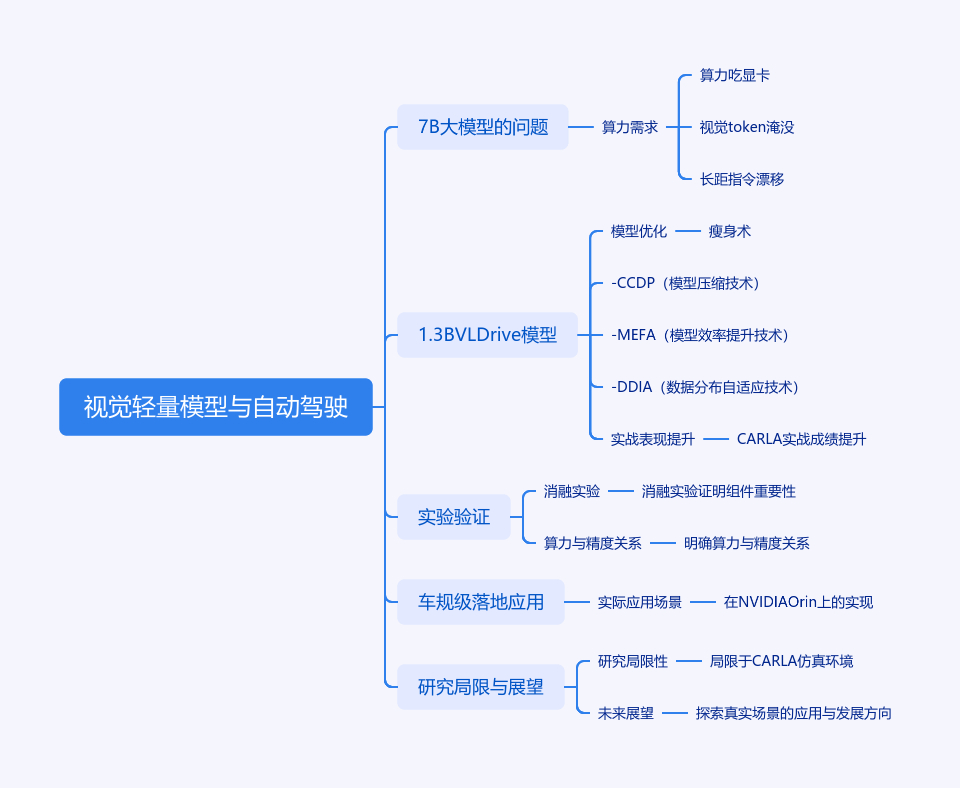 文章介绍了VLDrive视觉轻量模型,可让自动驾驶秒懂人话。7B车端大模型难落地,存在算力吃显卡、视觉token淹没、长距指令漂移等问题。VLDrive将参数量压至1.3B,采用CCDP、MEFA、DDIA方法,算力砍81%,CARLA成绩提升7.6%-16.8%。消融实验显示各组件重要性,还明确算力与精度兑换比例。该模型在NVIDIA Orin上可实现车规级落地,单帧33ms,流水线30FPS。不过研究仍局限于CARLA仿真,后续将探索真实场景。