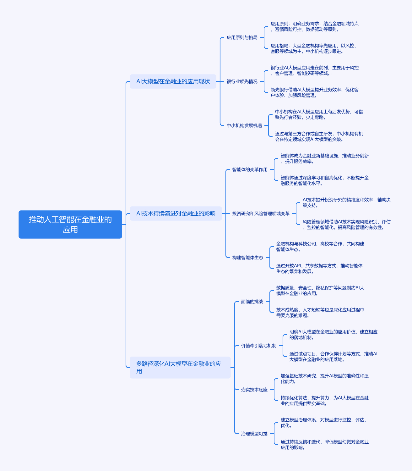 党的二十届四中全会及相关意见强调推动人工智能与产业结合。当前金融业AI发展进入大模型落地阶段,格局呈现头部引领与中小突围并行。应用遵循风险、内部提效、辅助决策优先原则。银行业领先,短期释放效率红利,长期拓展核心领域;技术普惠为中小机构提供换道机会。智能体作为前沿形态,在投资研究和风险管理领域带来变革,需构建开放标准化生态。金融AI应用面临算法黑箱等挑战,金融机构要坚持价值牵引构建落地机制,夯实技术底座,治理模型幻觉,保障AI应用行稳致远。