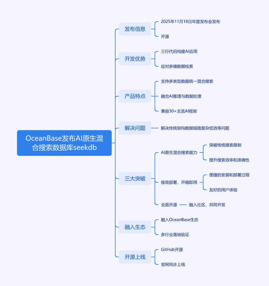 2025年11月18日,OceanBase在年度发布会上正式发布并开源首款AI原生混合搜索数据库seekdb。开发者用三行代码就能快速构建AI应用,应对百亿级多模数据检索。该数据库支持多类型数据统一混合搜索,融合AI推理与数据处理,兼容30+主流AI框架。它能解决传统架构数据链路复杂低效等问题,有AI原生混合搜索、极简部署、全面开源三大突破。seekdb可融入OceanBase生态,其混合搜索能力已在多个行业落地验证,目前已在GitHub开源,官网同步上线。