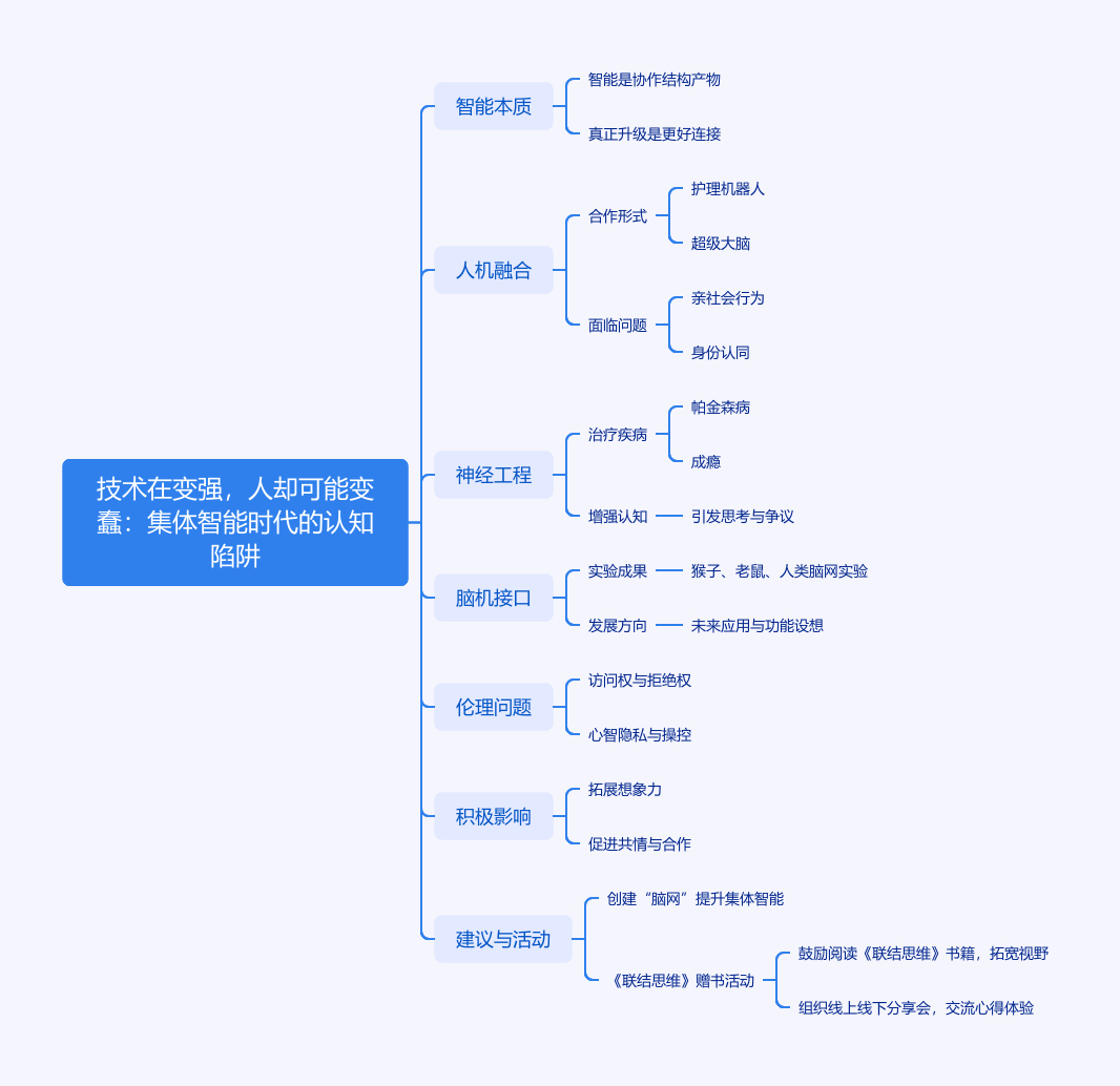 本文围绕人类与人工智能融合及脑机接口展开探讨。指出智能是协作结构产物,真正升级是更好连接。神经工程用于治疗疾病,也引发增强认知的思考。人类与人工智能合作有多种形式,如护理机器人辅助、创建超级大脑等,但面临诸多问题,像亲社会行为受损、身份认同困境等。脑机接口已有不少成果,如猴子、老鼠和人类脑网实验。技术发展引发伦理担忧,如访问权、隐私和操控等。不过,也有积极一面,如拓展想象力、促进共情。最后提出可创建自己的“脑网”提升集体智能,并介绍赠书活动。
