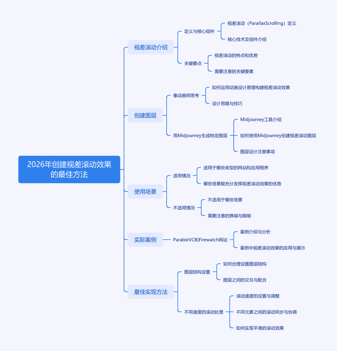 本文介绍2026年创建视差滚动效果的最佳方法。视差滚动指滚动时背景图像比前景内容移动慢,营造深度错觉。创建时可像动画师一样生成不同图层,如用Midjourney生成太空主题的背景、中景、前景层,且使用透明背景。视差滚动能让网站更难忘,但内容多、不支持减少动效偏好或时间紧时不适用。实际案例中,视差效果辅助内容而非替代。2026年推荐无库的直接滚动与变换方法,设置固定定位和引用操作图层,添加滚动监听器使各图层以不同速度移动。