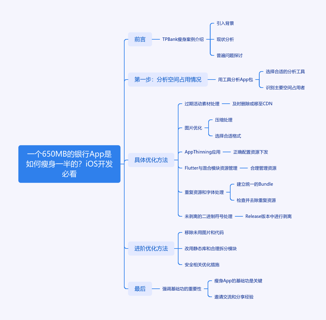 文章分享越南 TPBank 将 650 MB 的 iOS 银行 App 瘦身一半的经验。先借助工具分析,明确资源、Flutter 模块资源、冗余符号等占空间。随后提出优化方法,如删除过期活动素材、压缩图片、正确使用 App Thinning、处理 Flutter 模块资源、清理重复资源和字体、剥离二进制符号。最后提及进阶优化方向,包括移除未用图片代码、合理拆分模块、安全相关优化,强调做好基础功就能有效瘦身。