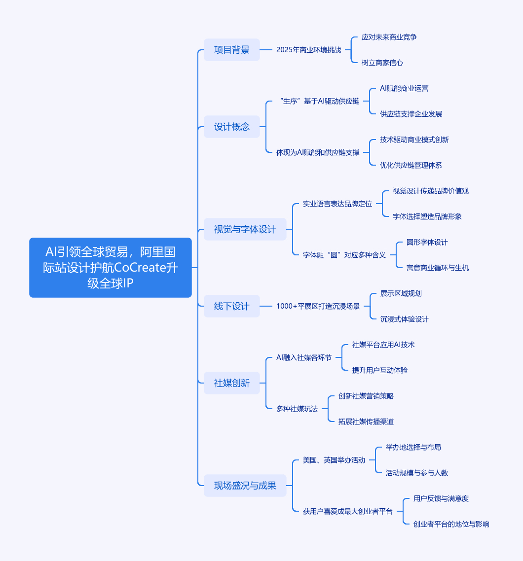 2025年全球商业环境动荡,中小企业面临挑战,阿里国际站设计团队借“从概念到品牌”设计焕新,为商家注入信心。本届CoCreate核心概念为“生序”,基于“AI驱动全球供应链”构建价值链路,体现在AI“激活式赋能”和供应链“确定性支撑”。视觉语言注重“厚度与扎实感”,字体设计融“圆”于其中。线下展区打造沉浸场景。社媒将AI融入细节,图片用AI制作,打造全AI生成的展会互动大地图,还有反转视频。整体品牌创意获全球B2B用户喜爱,助力CoCreate成全球最大创业者平台。