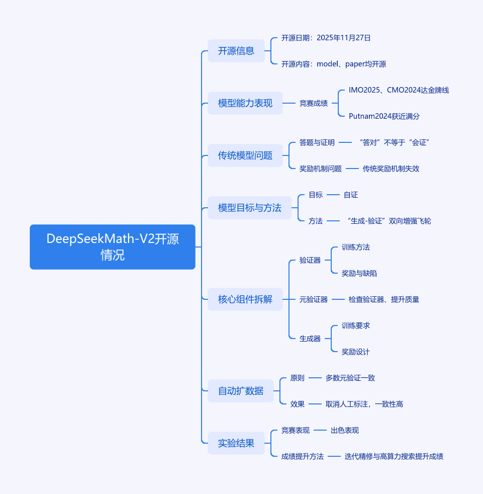 2025年11月27日,DeepSeek开源DeepSeek - Math - V2。该模型展现强大定理证明能力,在IMO 2025、CMO 2024达金牌线,Putnam 2024获近满分。过去大模型‘答对’不等于‘会证’,传统奖励机制在定理证明中失效。DeepSeekMath - V2目标是让模型像数学家一样自证。其采用‘生成 - 验证’双向增强飞轮方法,由证明生成器、证明验证器、元验证器组成强化学习闭环。验证器、元验证器、生成器各有训练方式和奖励设计,还能自动扩数据。实验显示,该模型在竞赛中表现出色,一步生成领先部分模型,迭代精修可提升成绩,高算力搜索能攻克难题。