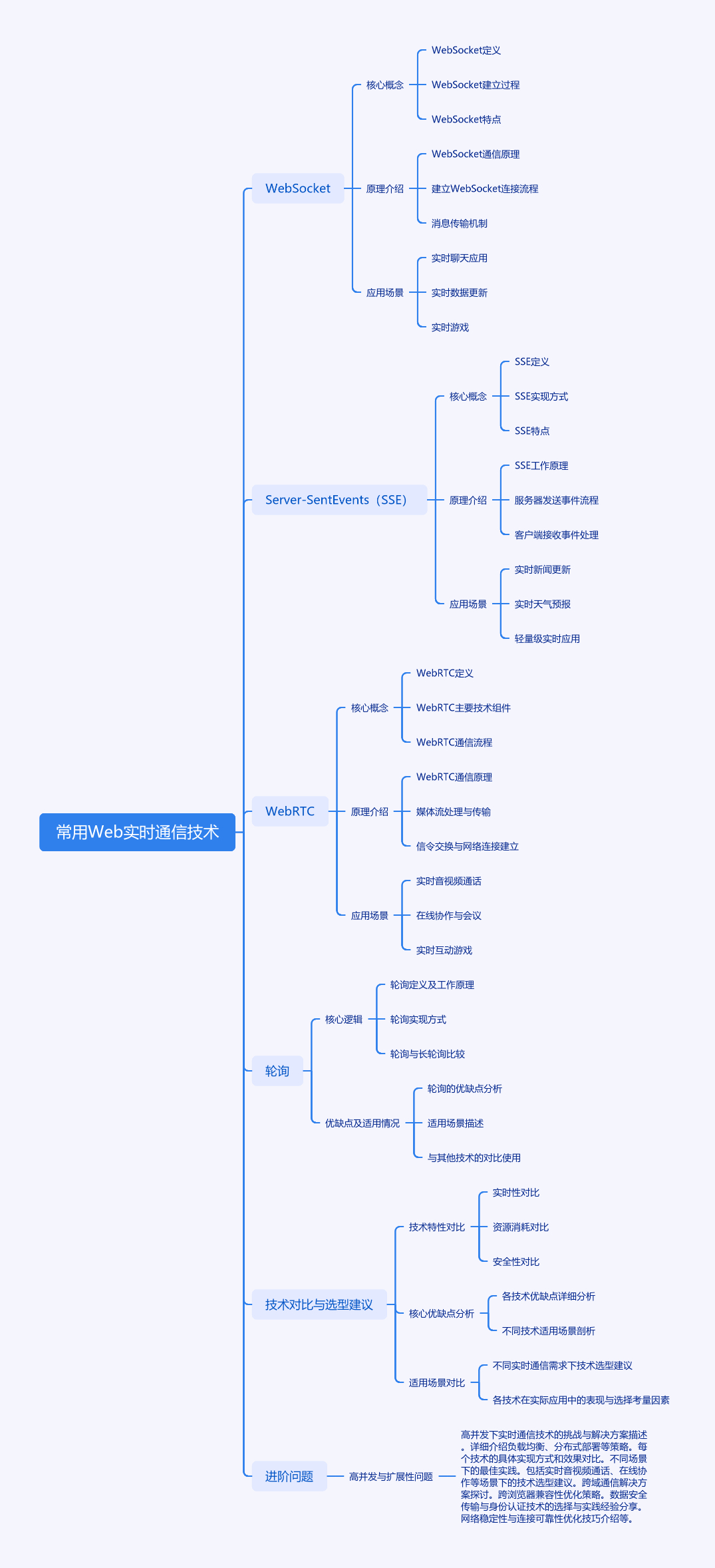 文章介绍常用Web实时通信技术,含原理、选型等。WebSocket是双向实时交互首选,分握手、传输、管理三阶段,适用于即时通讯等场景。SSE基于HTTP,单向推送,有自动重连,用于实时通知等。WebRTC支持浏览器点对点连接,用于音视频通话等。轮询是早期方案,兼容性强但开销大。还对技术对比选型,分析优缺点和适用场景,探讨高并发、安全、网络、跨域等进阶问题。