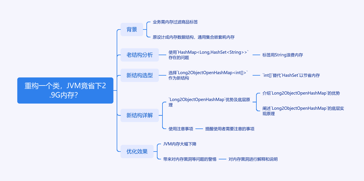 文章讲述重构核心类数据结构节省 JVM 内存的实践。业务需在内存过滤商品标签,原用 HashMap<Long, HashSet<String>>,在大规模数据下内存消耗大。经分析,标签 ID 为小于 5000 的正整数,原设计用 String 类型存在内存浪费。优化将其改为 Long2ObjectOpenHashMap<int[]>,用排序 int[] 配合二分查找替代 HashSet。生产环境中,JVM 堆内存从约 3.2GB 降至 211MB,降幅超 94%。文章还介绍 Long2ObjectOpenHashMap 优势、底层原理,如避免装箱、开放寻址等,同时提及使用注意事项。