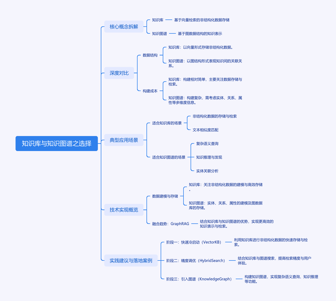 在大模型幻觉频发时,RAG 架构成解决办法,其核心是外部知识的存储与检索,涉及知识库和知识图谱。知识库是基于向量检索的非结构化数据存储,构建快、适合海量非结构化文本;知识图谱是基于图数据结构的知识表示,精确匹配、适合复杂关系。两者在数据结构、构建成本等维度有差异。知识库适用于企业文档问答等场景,知识图谱适用于金融风控等场景。技术实现上,两者各有工具链和存储方式,且有 GraphRAG 融合趋势。实践建议从向量知识库起步,按需引入知识图谱。