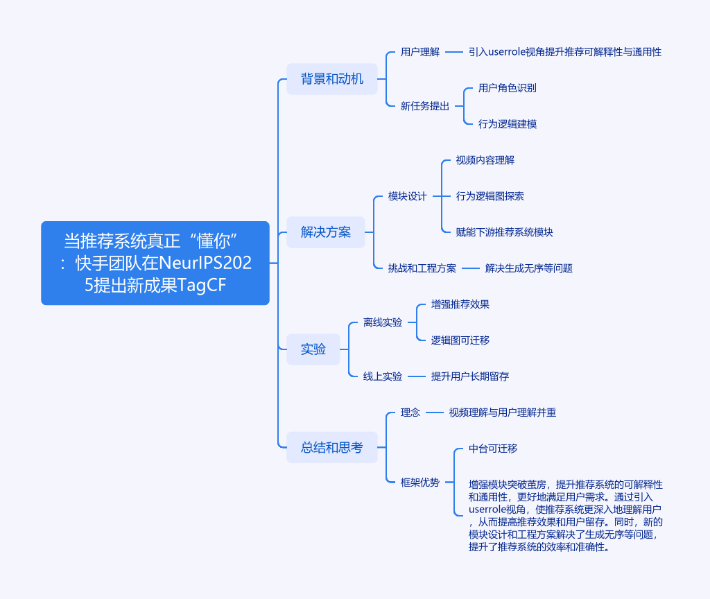 快手消费策略算法团队联合其他部门及高校提出 TagCF 框架,成果被 NeurIPS 2025 接收且代码开源。传统推荐系统重内容理解,忽视用户角色。TagCF 引入 user role 视角,拓展用户角色识别和行为逻辑建模新任务。其含视频内容理解、行为逻辑图探索和赋能下游推荐系统三个模块,解决了实现中的挑战。实验表明,TagCF 能增强推荐效果,逻辑图可迁移,不同变体特性不同,usertag 更优。该框架体现视频与用户理解并重理念,中台可迁移,增强模块能突破茧房,为行业带来新想象空间。