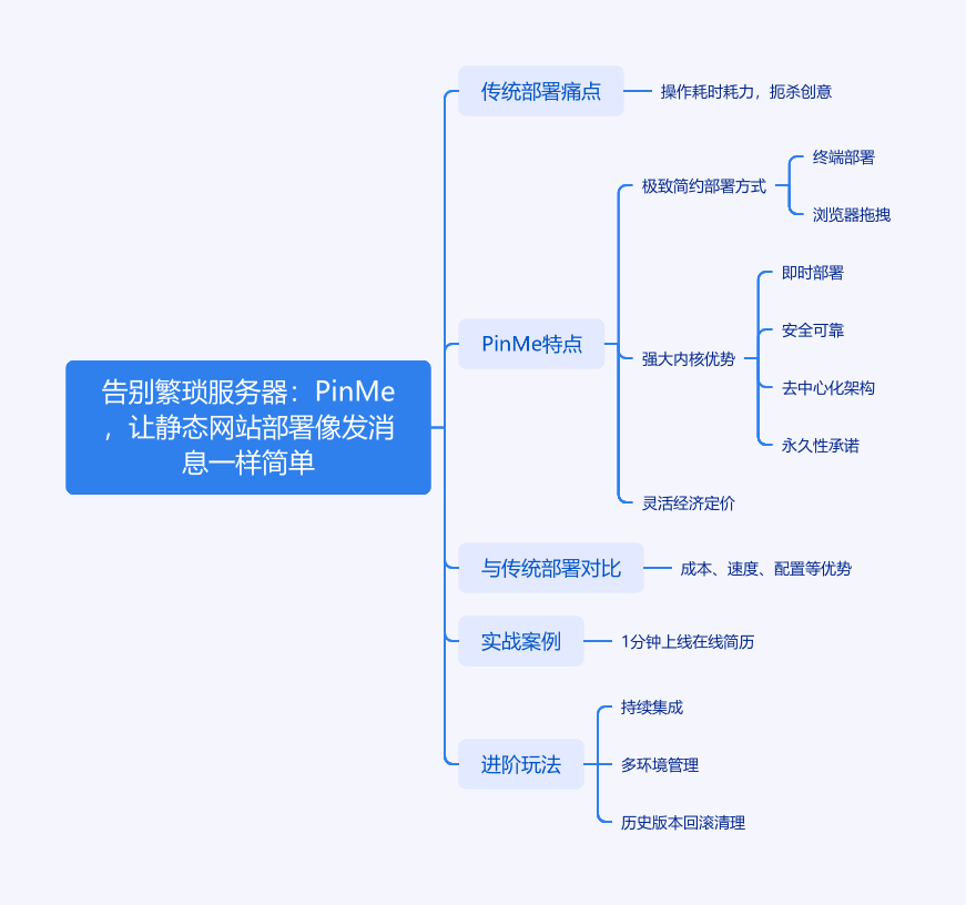 文章介绍了静态网站部署工具 PinMe,它让部署像发消息一样简单。有终端和浏览器拖拽两种部署方式,前者适合开发者,后者零门槛。其优势显著,基于 IPFS 技术,即时部署、安全可靠、去中心化且承诺永久托管。定价灵活,可免费开始按需升级。与传统部署相比,成本低、上线快、配置简单、流量不限、稳定性高。还给出实战案例,如用其 1 分钟上线在线简历,有网页和 CLI 两种上传方式,此外还有持续集成、多环境管理、历史版本回滚等进阶玩法。