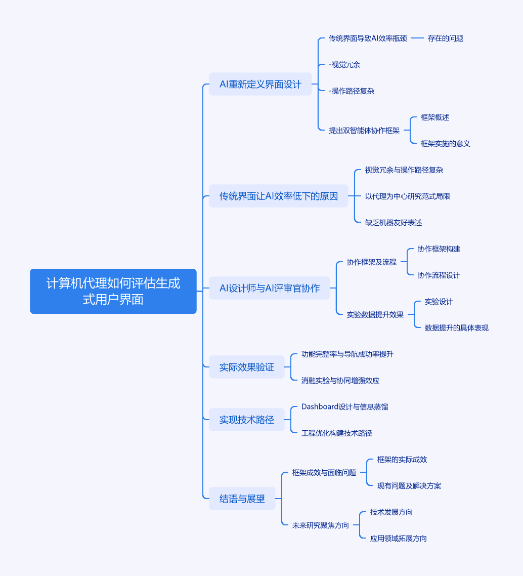 文章围绕计算机代理评估生成式用户界面展开。传统图形用户界面为人类视觉优化,使AI执行任务面临效率瓶颈,包括视觉冗余、操作路径复杂、缺乏机器友好表述等问题。研究提出Coder - CUA协作框架,Coder为设计师生成界面,CUA为评审官测试反馈。实验显示,该方法提升了功能完整率和CUA导航成功率,揭示了任务可解性与CUA导航的协同效应。通过Dashboard设计将操作历史转化为可视化摘要,构建了从原始操作到智能洞察的技术路径。此框架验证了任务可解性提升,但在复杂导航场景有瓶颈,未来研究将聚焦多模态融合与跨平台泛化。
