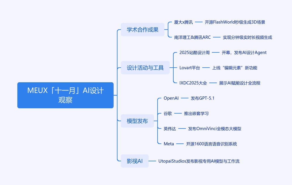 本文是MEUX「十一月」AI设计观察,介绍多项AI进展。学术合作成果有厦大与腾讯开源FlashWorld实现秒级生成3D场景,南洋理工与腾讯ARC实验室突破分钟级实时长视频生成。设计活动方面,2025站酷设计周开幕并推出AI设计Agent,IXDC2025大会展示AI赋能设计全流程。模型发布包括OpenAI的GPT - 5.1、谷歌的嵌套学习、英伟达的OmniVinci全模态大模型、Meta的1600语言语音识别系统,还有Utopai Studios发布影视专用AI模型与工作流。此外,Lovart平台上线“编辑元素”新功能。