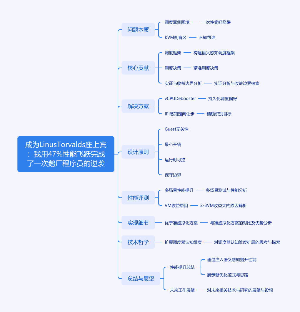 本文记录对Linux内核调度器深度重构,通过赋予KVM调度器“语义感知”能力,在高密虚拟化环境下实现Dedup工作负载47.1%性能提升。先指出高密部署中调度器成性能瓶颈,如yield_to()设计在现实中出现乒乓抢占等问题。接着介绍核心贡献,包括构建语义感知调度框架、精准调度决策及实证分析。解决方案含vCPU Debooster和IPI感知定向让步两机制。设计兼顾生产环境,如Guest无关、最小开销等。性能评测显示在多场景有显著提升,且解释2 - 3 VM时收益大的原因。还说明实现细节及优势,最后强调此工作展示新优化范式,突破传统瓶颈。