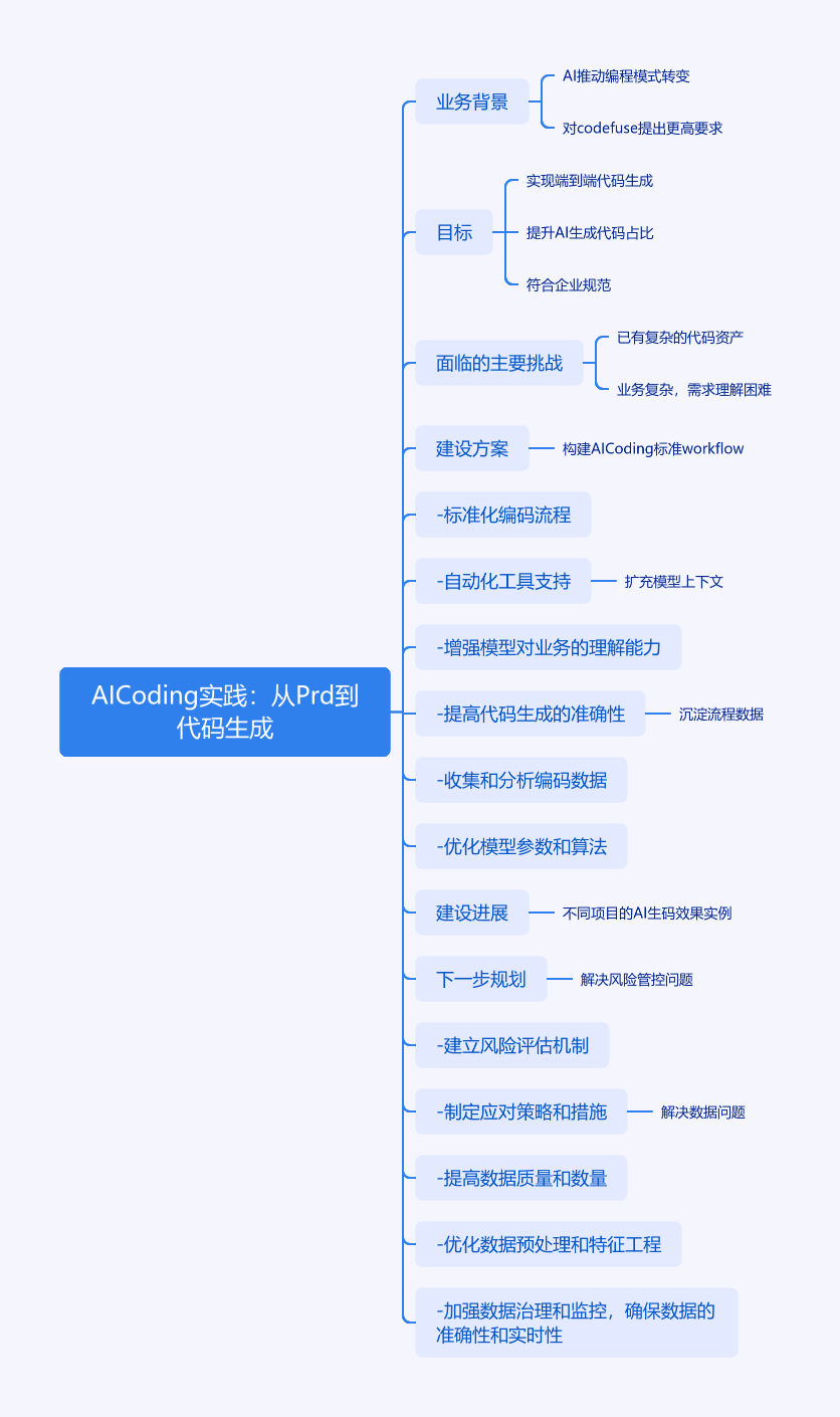 文章围绕AICoding实践,探讨从Prd到代码生成。业务背景是AI推动编程模式转变,对codefuse提出更高要求。目标包括实现端到端代码生成、提升AI生成代码占比、符合企业规范。面临已有复杂代码资产和业务理解困难挑战。建设方案从构建标准workflow、扩充模型上下文、沉淀流程数据三方面实现AICoding能力。建设进展展示了不同项目的AI生码效果。下一步规划针对缺乏风险管控标准和无历史评测数据问题,提出增强技术风险能力、优化编码规范和沉淀数据等方案。
