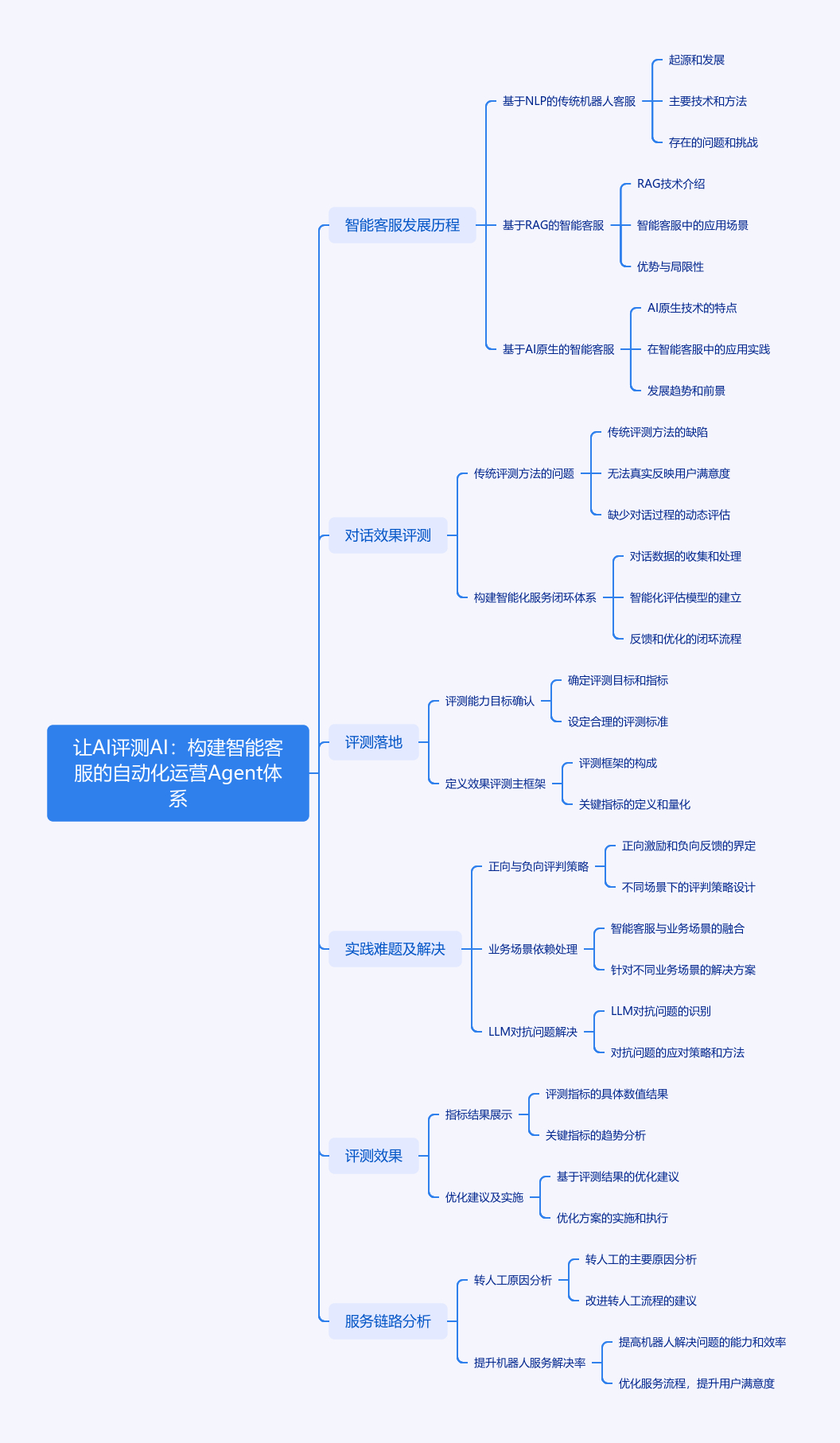 文章围绕智能客服的发展及评测展开。首先回顾智能客服从基于NLP的传统机器人客服,到基于RAG的智能客服,再到基于AI原生的智能客服的演进历程。接着指出商业化交付需关注对话效果评测,为此构建了“评估 - 诊断 - 优化”三位一体的运营Agent平台,实现客服机器人服务质量持续进化。评测落地要确认目标、拆解链路、定义框架,包括构建评测集、归类根因、生成优化建议等。实践中会遇到正向评判还是负向评判、业务场景依赖、LLM对抗等难题,并给出解决办法。最后展示了评测效果,还探讨了从服务链路角度AI可做的事,如分析转人工原因,提升机器人服务解决率。