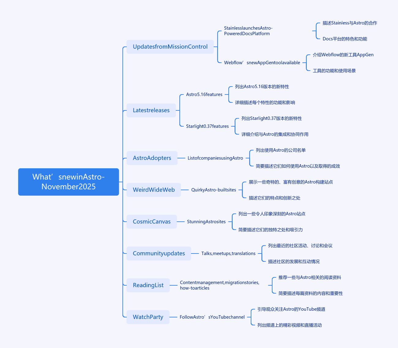 本文介绍2025年11月Astro生态系统的最新动态。包括任务控制更新,如Stainless推出Astro驱动的文档平台等;最新版本发布,如Astro 5.16和Starlight 0.37有新特性和改进;众多知名公司采用Astro。还展示了一些用Astro构建的奇特网站,如AgeMDB等。社区方面,有ViteConf演讲视频、人员演讲安排、线下聚会等活动,且官方文档教程被翻译成德语。内容上,有管理内容的工具,如Astro Editor,还有迁移案例、教程文章等,最后推荐关注官方YouTube频道。
