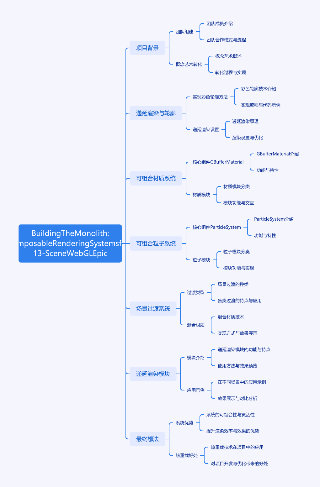 文章围绕13场景WebGL项目《The Monolith Project》展开,介绍了构建该项目的可组合渲染系统。团队为实现项目艺术风格,开发了多个系统。递延渲染与轮廓方面,经研究选用基于深度和法线的边缘检测法实现彩色轮廓,通过设置WebGLRenderTarget和G - Buffer减少内存。可组合材质系统将着色器功能封装成组件,方便组合形成材质。可组合粒子系统用ping - pong渲染计算粒子数据,有多种模块控制粒子发射、位置等。场景过渡系统为不同场景过渡开发了四种材质进行混合。这些系统封装、可组合且可复用,提升了开发效率。