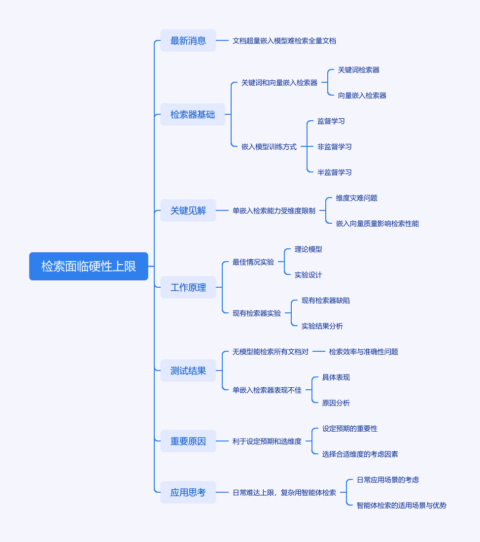 文章指出检索面临硬性上限。研究表明,当文档数量超阈值,检索器嵌入模型不足以检索全部相关文档。检索器有基于关键词和向量嵌入两种,后者通过对比学习训练嵌入模型。理想下单嵌入检索器应能返回任意文档子集,但现实中其检索能力受嵌入维度限制。研究人员通过两项实验衡量嵌入空间能表示的最大文档对数量,结果显示不存在能检索所有文档对的模型,单嵌入检索器表现不佳,而基于关键词的 BM25 和多嵌入的 ModernColBERT 效果较好。理解单嵌入检索理论极限有助于设定性能预期,实际应用中日常检索难触及理论上限,复杂查询可采用智能体检索。