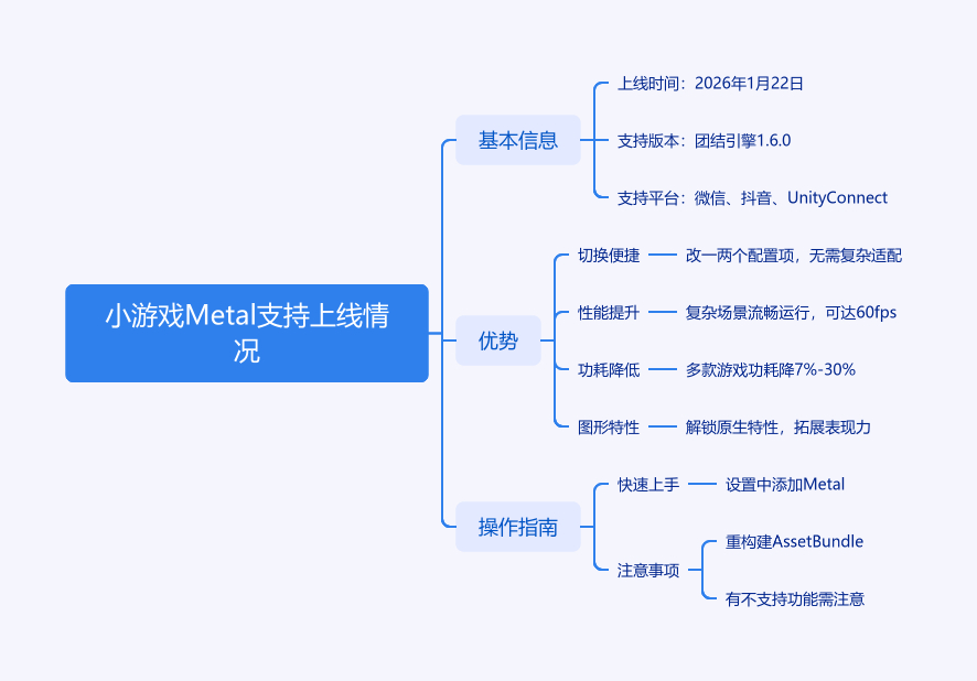 2026年1月22日Unity官方平台宣布,自1.6.0版本起,团结引擎在小游戏平台支持Metal图形API,微信与抖音同步支持。开发者将WebGL小游戏切换至Metal渲染,仅改一两个配置项即可。Metal让小游戏在iOS上获原生图形API能力,实现复杂场景60fps流畅运行。它还能降低功耗,测试显示多款小游戏功耗降7% - 30%。此外,解锁iOS原生图形特性,拓展图形表现力。目前支持平台不断拓展,包括微信、抖音、Unity Connect等。开启需在设置中添加Metal并注意相关事项,1.8.0起安卓小游戏平台支持Vulkan。