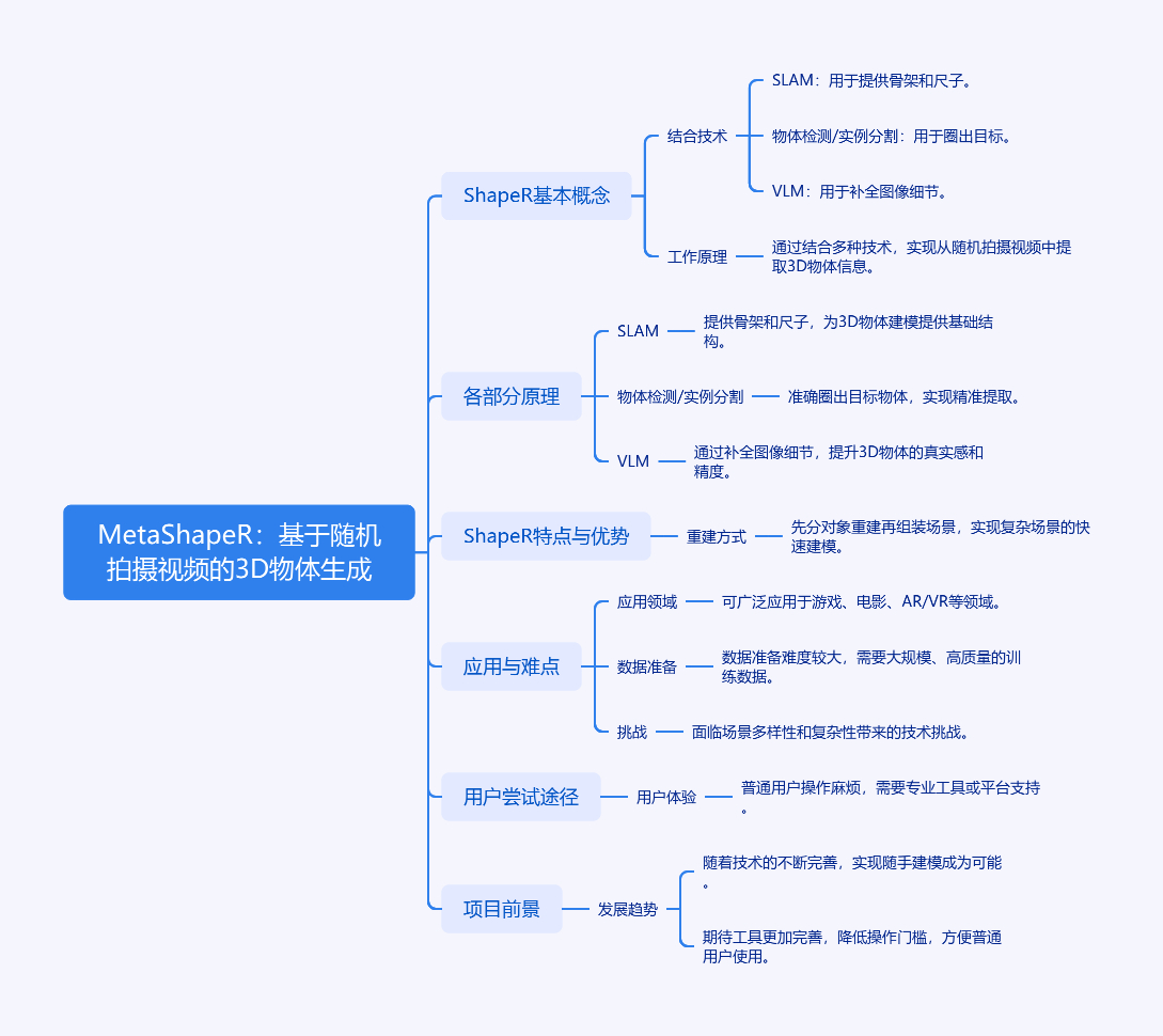 近日 Meta 开源 ShapeR 项目,能将普通图像序列转换为完整的度量场景重建。它结合 SLAM 得到的稀疏点云与相机位姿、物体检测/实例分割得到的对象实例、VLM 生成的文本 caption 来生成物体的 3D mesh。SLAM 是核心,可得到“摄影师的足迹”和“物体的骨架”;物体检测/实例分割是“自动抠图”和“聚光灯”;VLM 提供文本描述以补全细节。ShapeR 先检测场景对象,再单独重建 mesh 后组装成场景,可单独操作物体、导出编辑。其作用丰富,但核心难点在数据准备,目前依赖闭源的 Aria MPS 服务。普通用户可尝试但过程麻烦,期待后续转换工具完善。