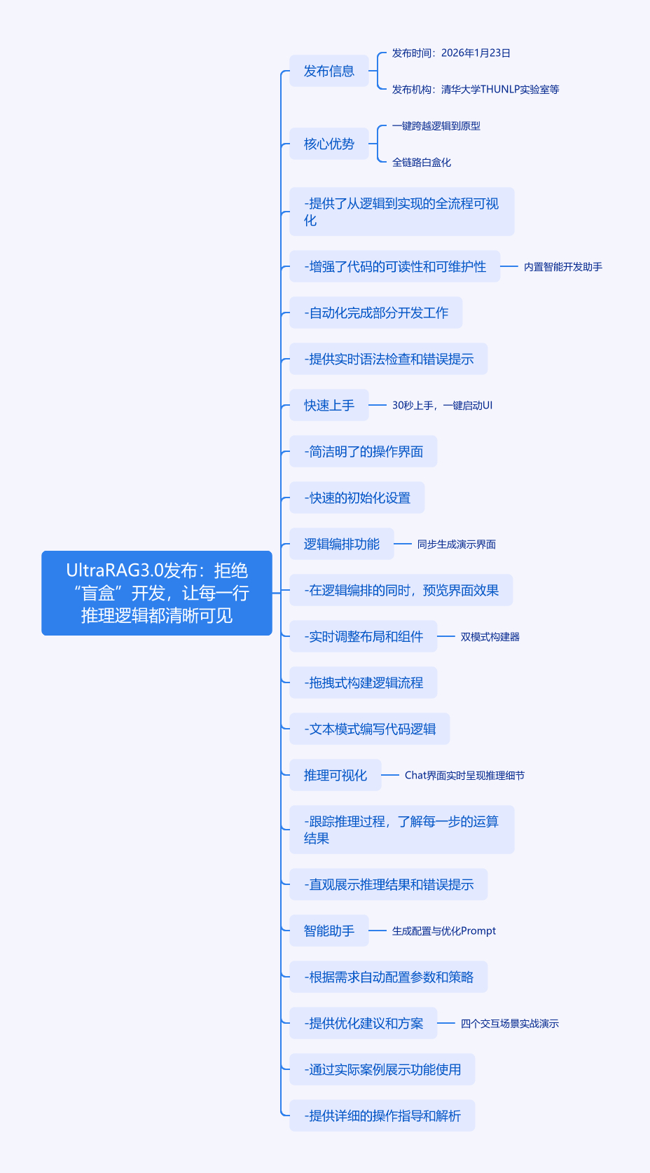 2026年1月23日,清华大学THUNLP实验室等联合发布UltraRAG 3.0。该框架针对算法开发痛点,有三大核心优势:提供“所见即所得”的Pipeline构建器,让算法工程师专注逻辑编排;打造“透明化”推理验证窗口,实时呈现推理细节;内嵌AI助手,辅助生成配置与优化Prompt。它能30秒快速上手,一键启动UI。其逻辑编排可同步生成演示界面,支持双模式构建。Chat界面可对推理过程像素级可视化,缩短优化周期。智能助手能自动生成Pipeline草稿、优化Prompt等,还展示了四个交互场景实战演示。