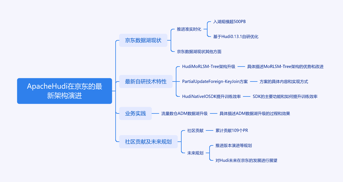 本文介绍京东数据湖现状、自研技术、业务实践、社区贡献与未来规划。京东数据湖利用Hudi推进数据准实时化,入湖规模超500PB。基于Hudi 0.13.1版本,在组织协议层和IO传输层自研优化。自研技术有Hudi MoR LSM - Tree、Partial Update Foreign - Key Join、Hudi NativeIO SDK。业务实践聚焦流量数仓ADM数据湖升级并解决诸多问题。京东Hudi团队向社区贡献109个PR。未来规划是推进版本演进、支持多模态和NativeIO能力、探索湖流一体方案。