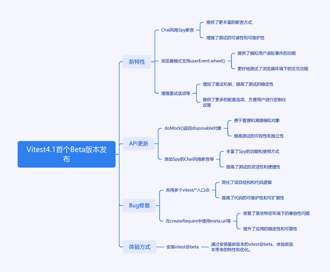 2026 年 1 月 24 日,Vitest 4.1 首个 Beta 版本发布。新特性包括 Chai 风格的 Spy 断言、浏览器模式支持 userEvent.wheel()、针对不稳定测试的增强重试选项、doMock() 返回 Disposable 对象、遵循覆盖率的 ignore start/stop 提示等。API 有多项更新,如 doMock() 返回 disposable 对象、添加 Spy 的 Chai 风格断言等。同时修复了多个 Bug,像弃用多个 vitest/* 入口点、在 createRequire 中使用 meta.url 等。可安装 vitest@beta 立即体验。