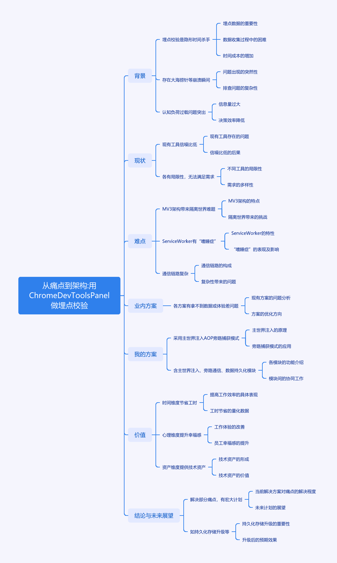 文章以用 Chrome DevTools Panel 做埋点校验为主题,先指出现代互联网企业开发中埋点校验易被忽视,存在大海捞针、稍纵即逝、参数黑盒等问题,导致认知负荷过载。接着分析现有工具在埋点校验上信噪比低,无法满足需求。开发时面临 MV3 架构带来的隔离世界、Service Worker 及通信链路的难题。业内现有方案各有不足。为此提出 zzChromeTools 方案,采用主世界注入的 AOP 旁路捕获模式,包含主世界注入、旁路通信和数据持久化模块。该工具在时间、心理和资产维度均有价值,未来还计划进行持久化存储升级、全协议覆盖、自动化测试集成等。